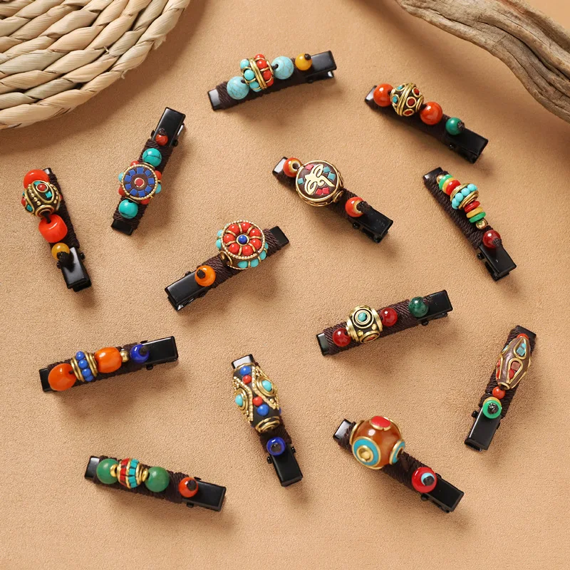 Handcrafted with traditional Tibetan artistry, these gemstone hair clips combine cultural heritage with contemporary elegance. Each piece features authentic materials and intricate detailing, reflecting centuries-old craftsmanship. The natural gemstones add a touch of sophistication while the secure grip keeps hair in place throughout the day. Perfect for those who appreciate meaningful accessories that tell a story. A versatile addition to any collection, these clips work beautifully with both casual and formal styling.